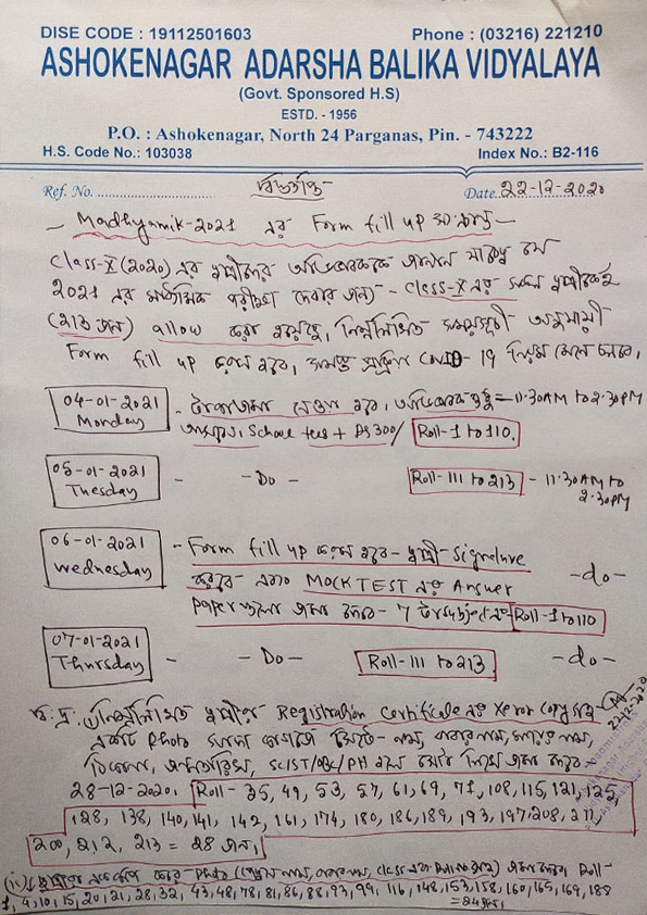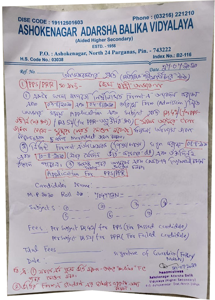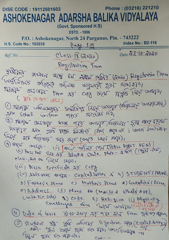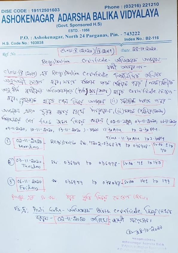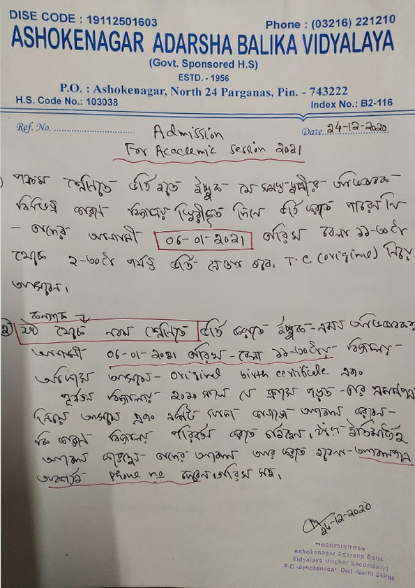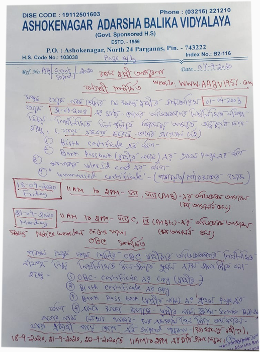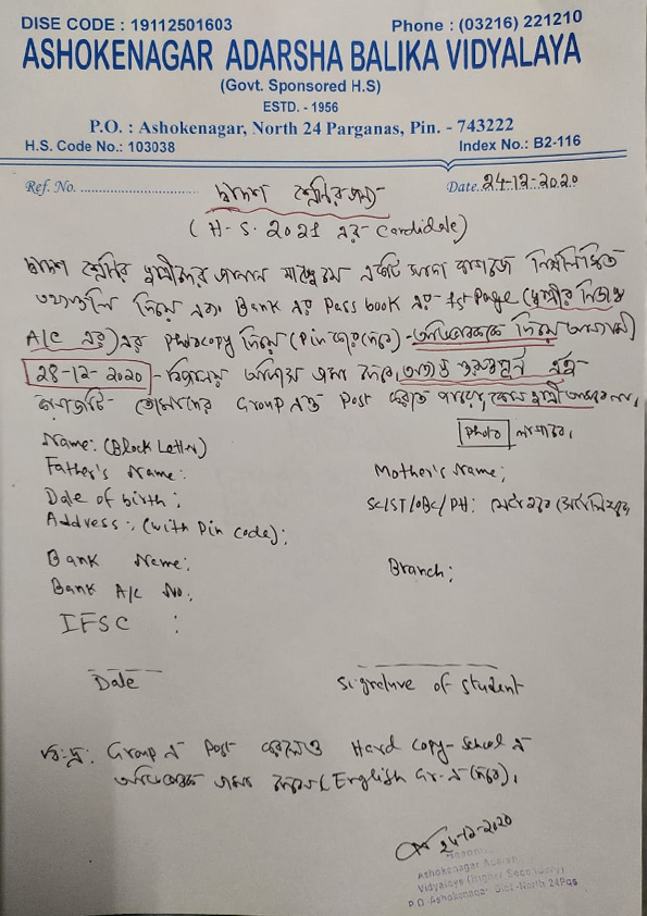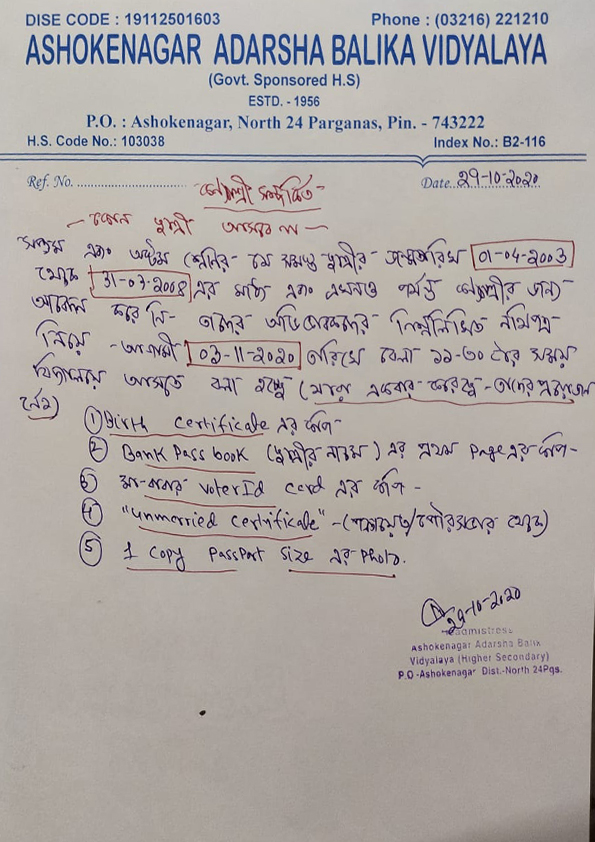 i) পিতা/মাতা ছাত্রী Original মাধ্যমিকের এডমিট কার্ড এবং রেজিস্ট্রেশন সার্টিফিকেট নিয়ে আসবেন।