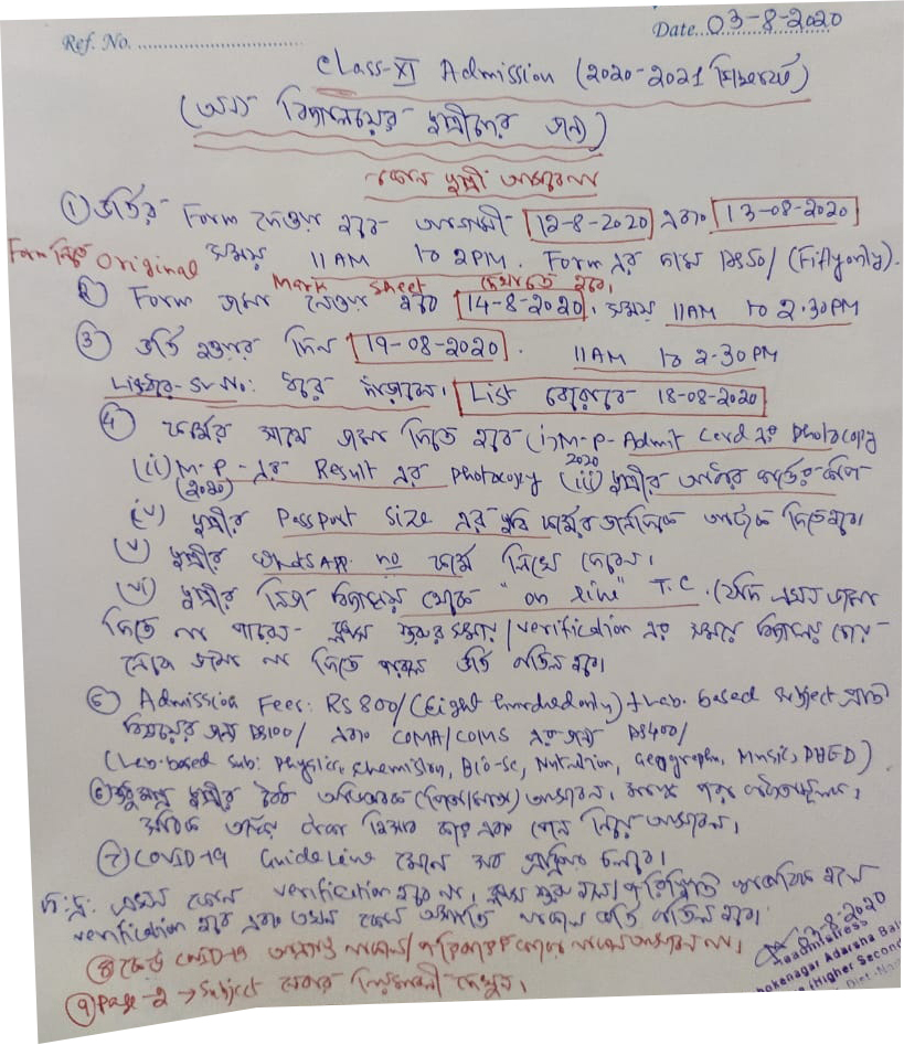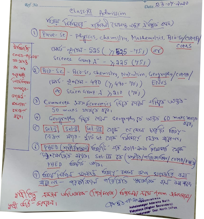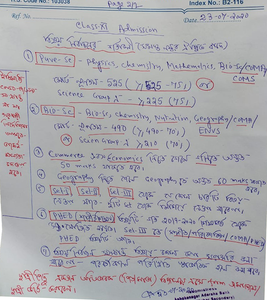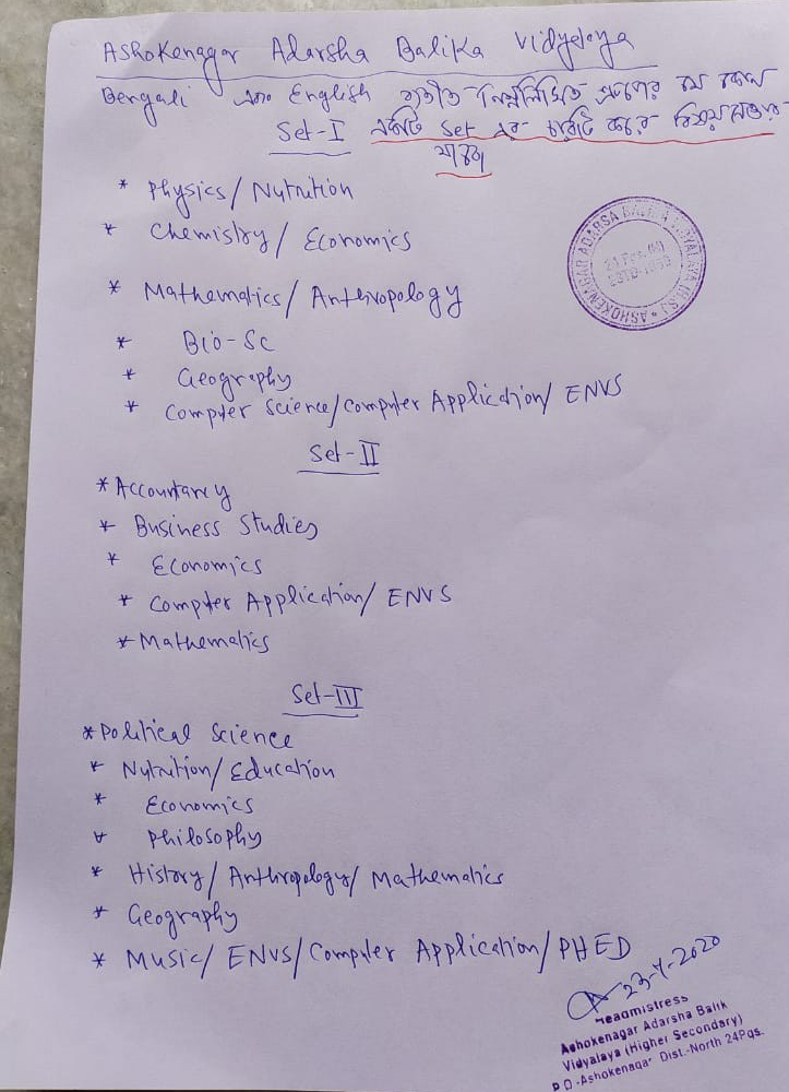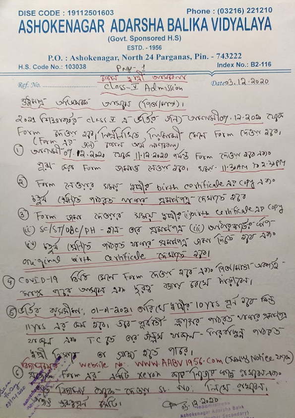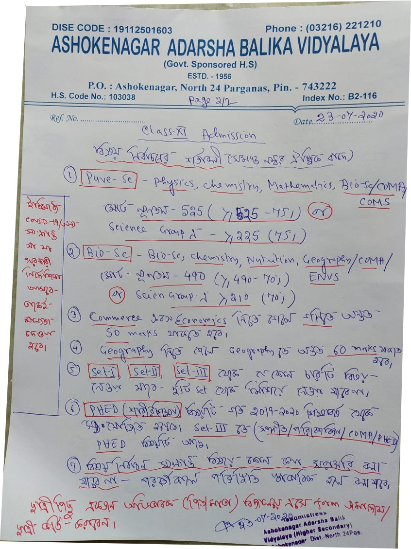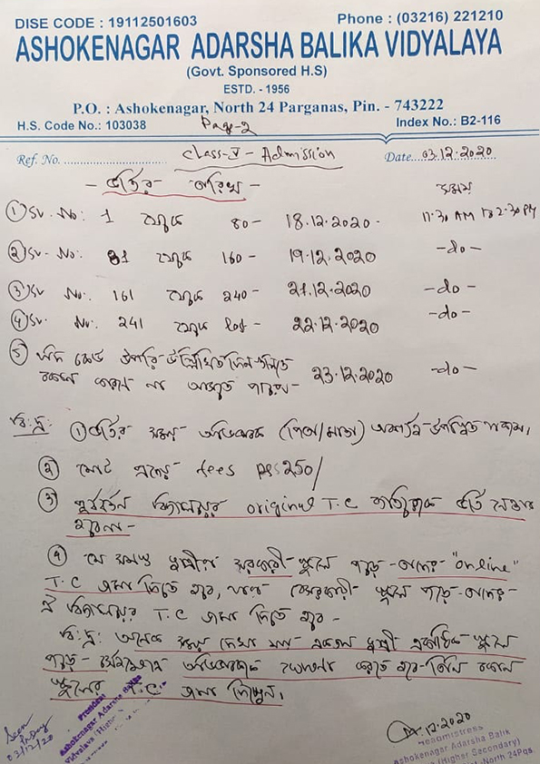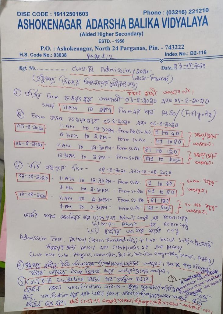 নিজেদের বিদ্যালয়ের ছাত্রীদের ক্লাস XI এ ভর্তির বিজ্ঞপ্তি 23-7-2019 দেওয়া হবে। 1-8-2020 থেকে 10-8-2020 এর মধ্যে সম্পন্ন প্রক্রিয়া শেষ করা হবে। অন্য বিদ্যালয়ের ছাত্রীদের ভর্তি বিজ্ঞপ্তি 12-08-2020 দেওয়া হবে।