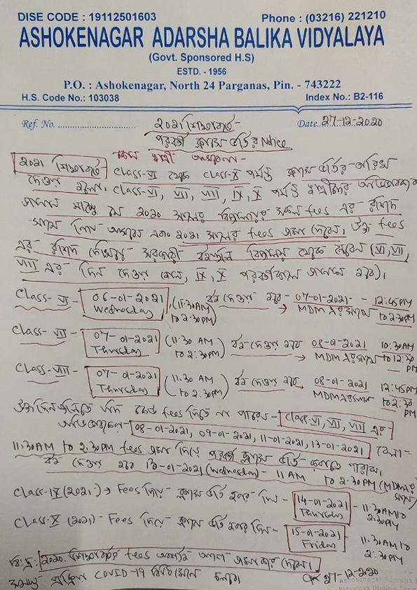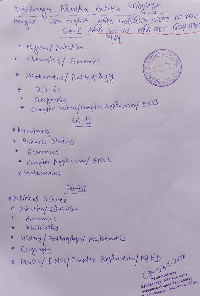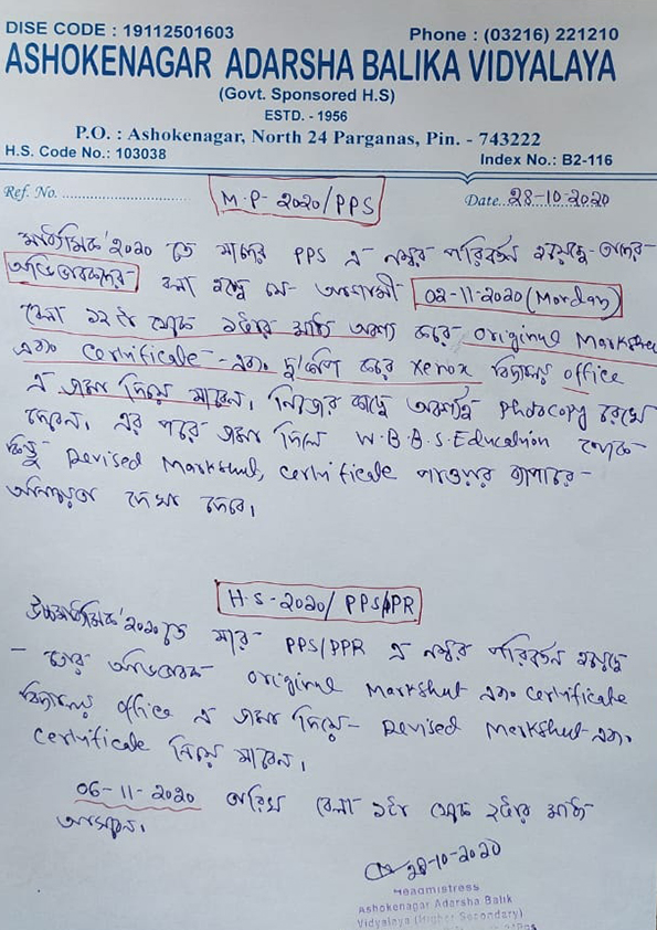 আগামী 23-7-2020 তারিখে নিম্নলিখিত তালিকা অনুযায়ী মাধ্যমিক পরীক্ষার্থীদের পিতা-মাতা (বৈদ্য অভিভাবক) কে M.P মার্কশিট এবং সার্টিফিকেট দেওয়া হবে।