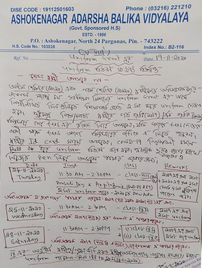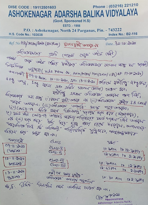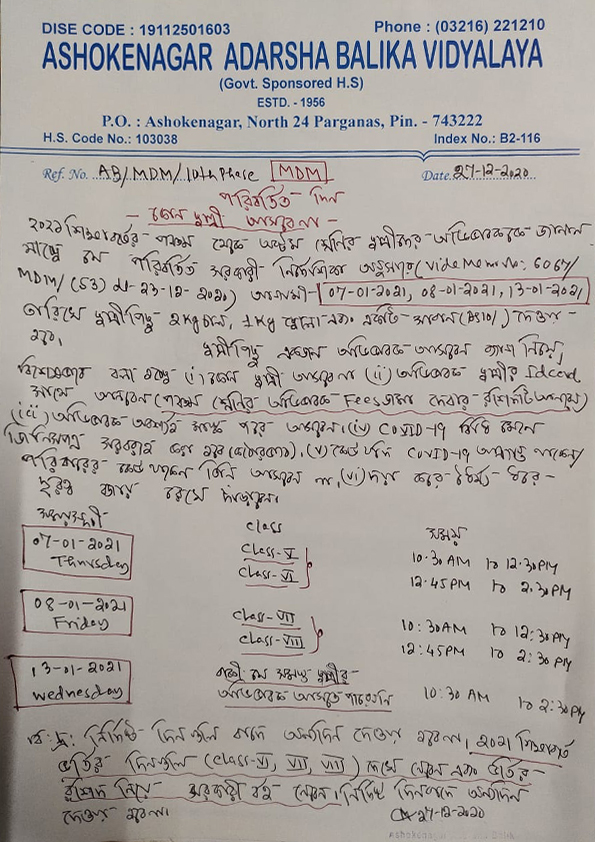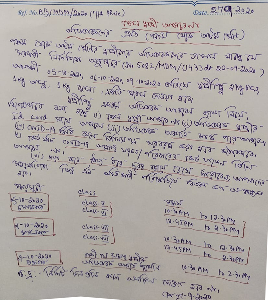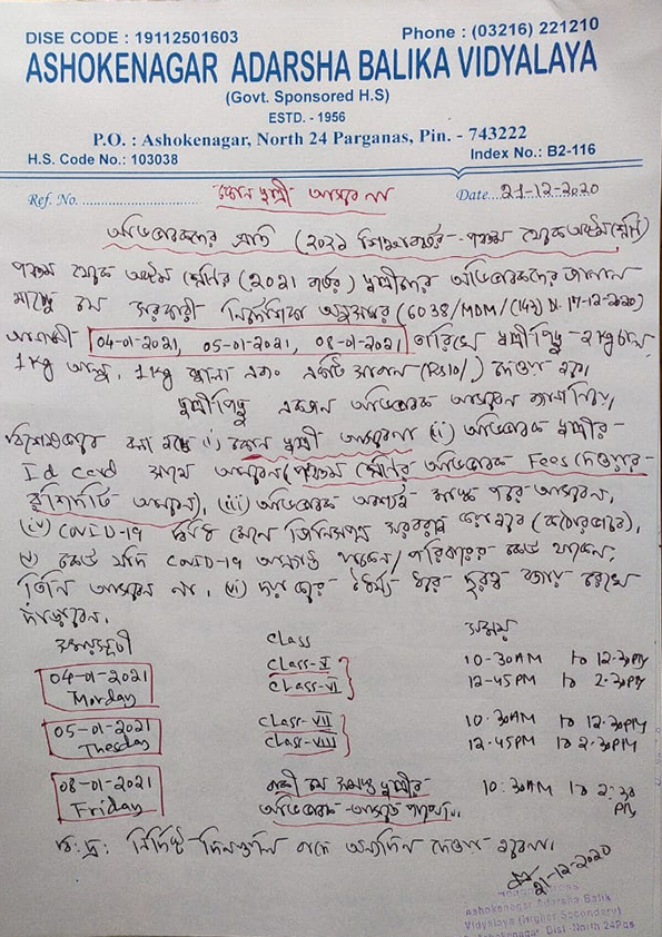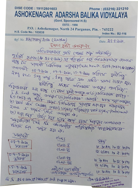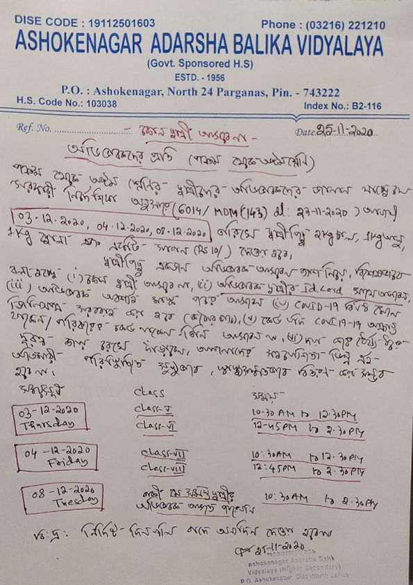 পঞ্চম থেকে অষ্টম শ্রেণী ছাত্রীদের অভিভাবকদের জানানো যাচ্ছে যে সরকারি নির্দেশিকা অনুসারে (5021/mdm(143) dt 29-06-2020) আগামী 08-07-2020, 09-07-2020, 13-07-2020 তারিখে ছাত্রীপিছু 2 Kg চাল , 2 Kg আলু, 250 গ্রাম মুসুর ডাল এবং 50ml স্যানিটাইজার দেওয়া হবে৷