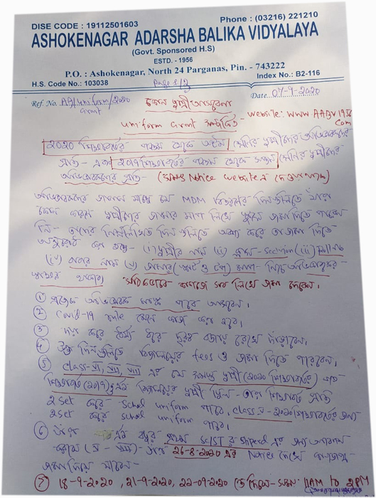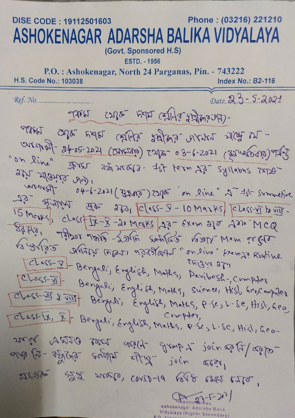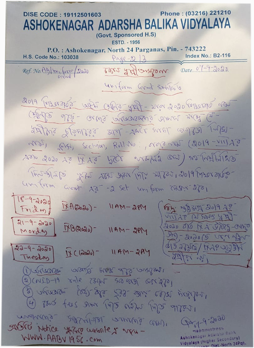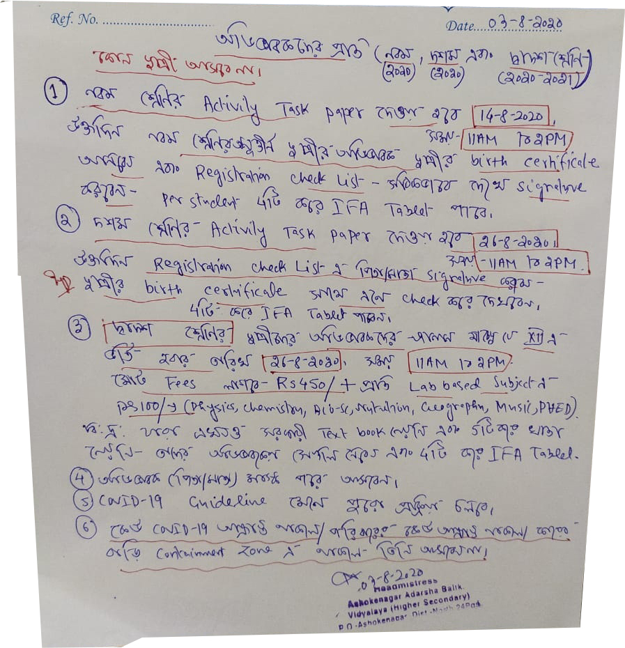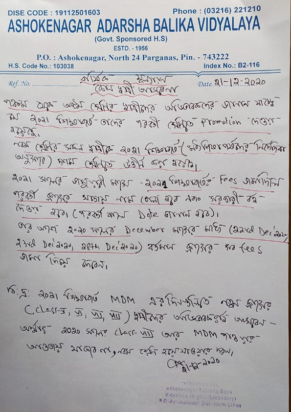 দ্বাদশ শ্রেণীর অভিভাবকদের জানানো যাচ্ছে যে যারা এখনো সরকারি বই নেয়নি ৷ তারা অবশ্যই আগামী 13-07-2020 সোমবার ছাত্রীরা রেজিস্ট্রেশন কার্ড এনে বইগুলি সংগ্রহ করিবেন এবং দ্বাদশ শ্রেণীর প্রত্যেক ছাত্রী পাঁচটি করে খাতা পাবে। যারা গত 04-07-2020 এবং 09-07-2020 বই নিয়ে গেছে, কিন্তু খাতা পায়নি। তারাও রেজিস্ট্রেশন কার্ড এনে খাতাগুলি সংগ্রহ করে নিয়ে যাবেন। (খাতা পড়ে এসেছে তাই) (13-07-2020 বেলা 11 টা)