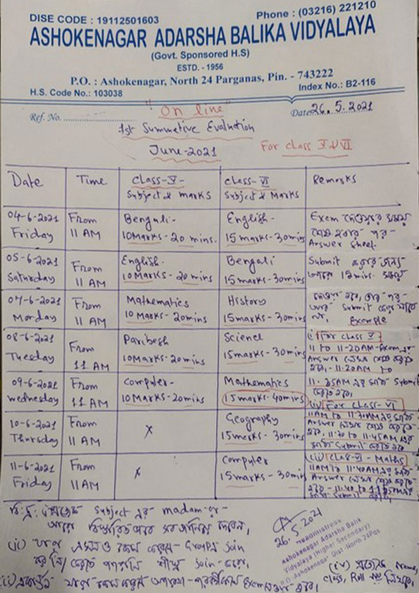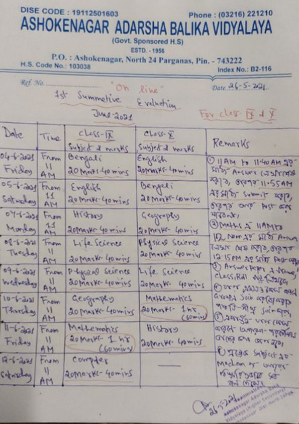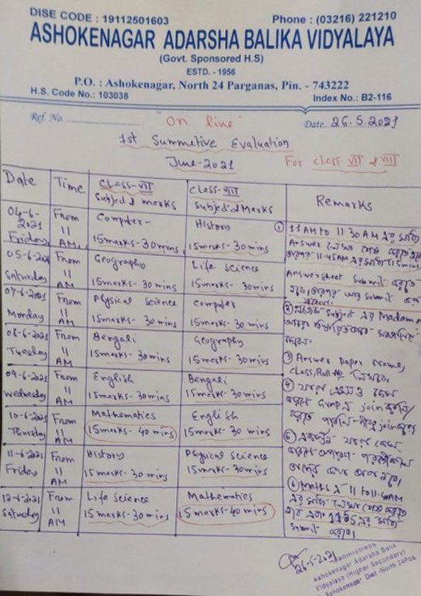 নির্দিষ্ট দিনগুলি বাদে অন্য দিনে দেওয়া হবে না এবং Activity Task এর paper গুলো ছাত্রীকে দিয়ে Answer করিয়ে বিদ্যালয় জমা দেবেন।